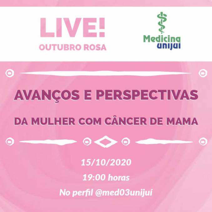 Estudantes de Medicina da Unijuí promovem, na quinta-feira, dia 15 de outubro, live sobre o Outubro Rosa. O evento terá alguns convidado e será transmitido pelo Instagram da turma @med03unijui, à partir das 19hs, com o tema “Avanços e perspectivas da mulher com câncer de mama”, proveniente da Unidade Integradora do curso.