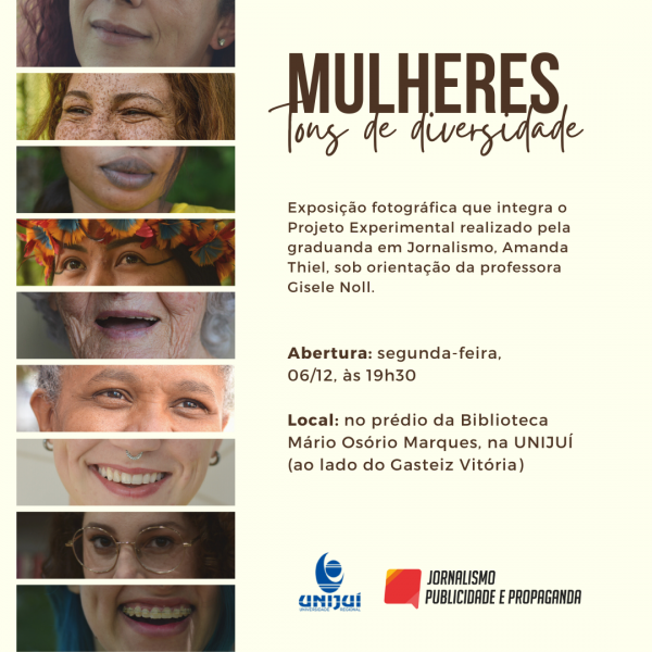 Na segunda-feira, 6 de dezembro, terá início a exposição fotográfica “Mulheres: tons de diversidade”, produto final do Projeto Experimental realizado pela graduanda em Jornalismo, Amanda Calegaro Thiel, como Trabalho de Conclusão de Curso, sob orientação da professora Gisele Noll. A abertura oficial da mostra ocorre às 19h30, no espaço do Gasteiz Vitória, no prédio da Biblioteca Mário Osório Marques.