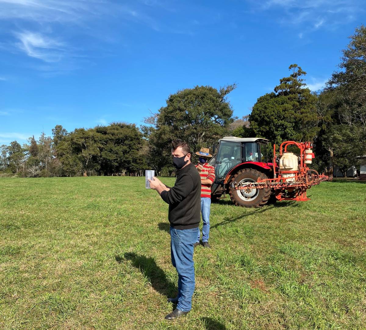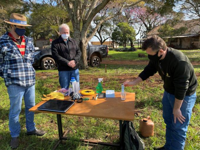 Por fim, porém não menos importante, realizou-se a regulagem do equipamento de pulverização e demonstração do uso correto de EPI’s. César, com o auxílio do técnico administrativo e acadêmico de Agronomia Rafael Dalla Rosa, demonstrou um passo a passo detalhado e muito didático de como realizar a regulagem e aferição do equipamento, que é de grande importância no dia a dia do agricultor que, por muitas vezes, passa despercebido durante a rotina e ocasiona perdas na qualidade da aplicação.