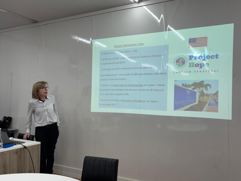 A convidada é certificada como Registered Behavior Technician (RBT) pela BACB e em Professional Crisis Management (PCM), além de ser pós-graduanda em Intervenção em ABA para Autismo e Deficiência Intelectual pelo CBI of Miami. Rosane já atuou no Project Hope for Autism Services, em Jupiter, Flórida, e atualmente é voluntária no Els Center of Excellence. Em ambas as instituições, seu trabalho foi voltado ao ensino de pessoas autistas — experiência que ela compartilhou com os estudantes durante o encontro.