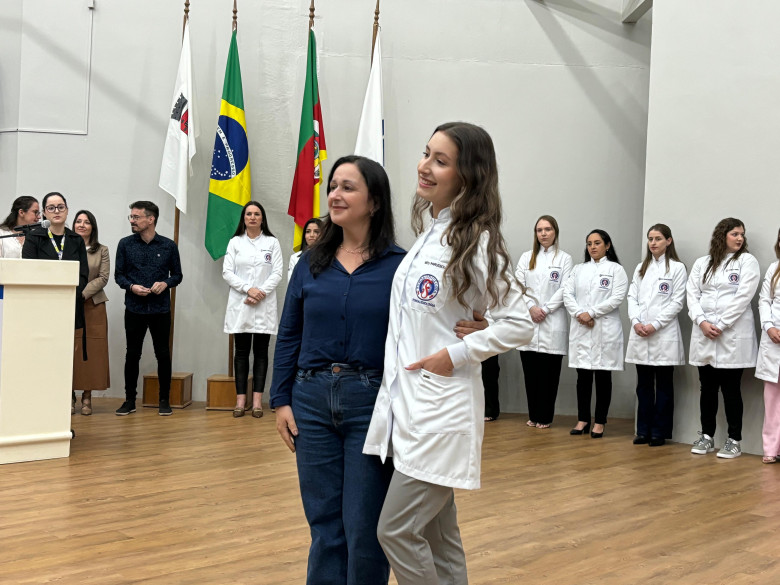 A cerimônia ocorreu no Auditório do campus, com a presença de professores, familiares, profissionais convidados e do Prof. Tiago Pereira, fiscal do Conselho Regional de Fonoaudiologia do Estado do Rio Grande do Sul. Os jalecos foram entregues pelos próprios familiares dos estudantes, simbolizando o compromisso com a ética, o cuidado e a responsabilidade exigidos pela prática profissional na área da saúde.