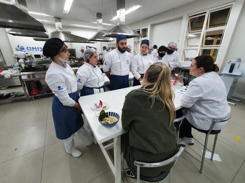 “Durante todas as aulas, os estudantes fizeram suas práticas com o mesmo grupo. Para a avaliação final, cada grupo precisou desenvolver três receitas com insumos, ingredientes orientais e técnicas trabalhadas. Havia um tempo definido de pré-preparo e apresentação, mas a escolha dos pratos ficou a cargo dos alunos”, explicou a professora responsável pela disciplina, Raquel Köhler Dal Ri, que avaliou os pratos ao lado da coordenadora do curso, professora Adriane Huth.