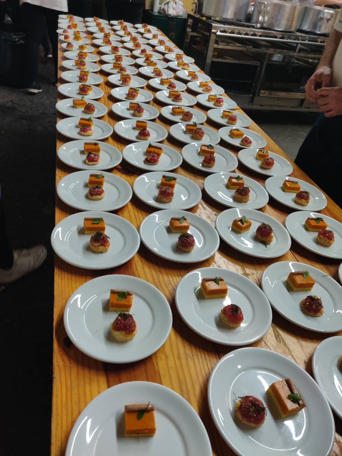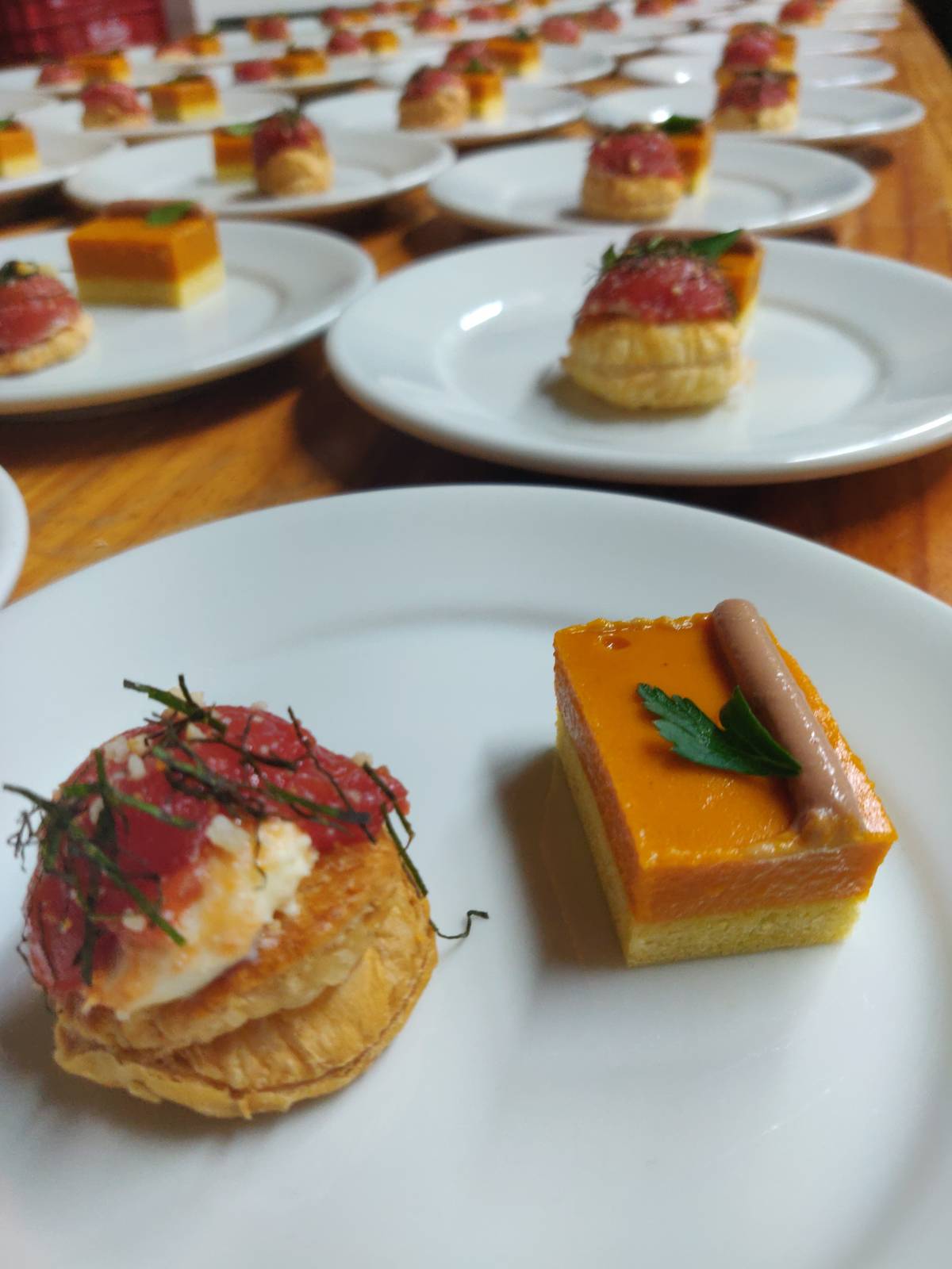Canapés - torta de cenoura com milho e patê de fígado. - Bombom caprese (tomates assados, creme de mozarela de búfala e manjericão).