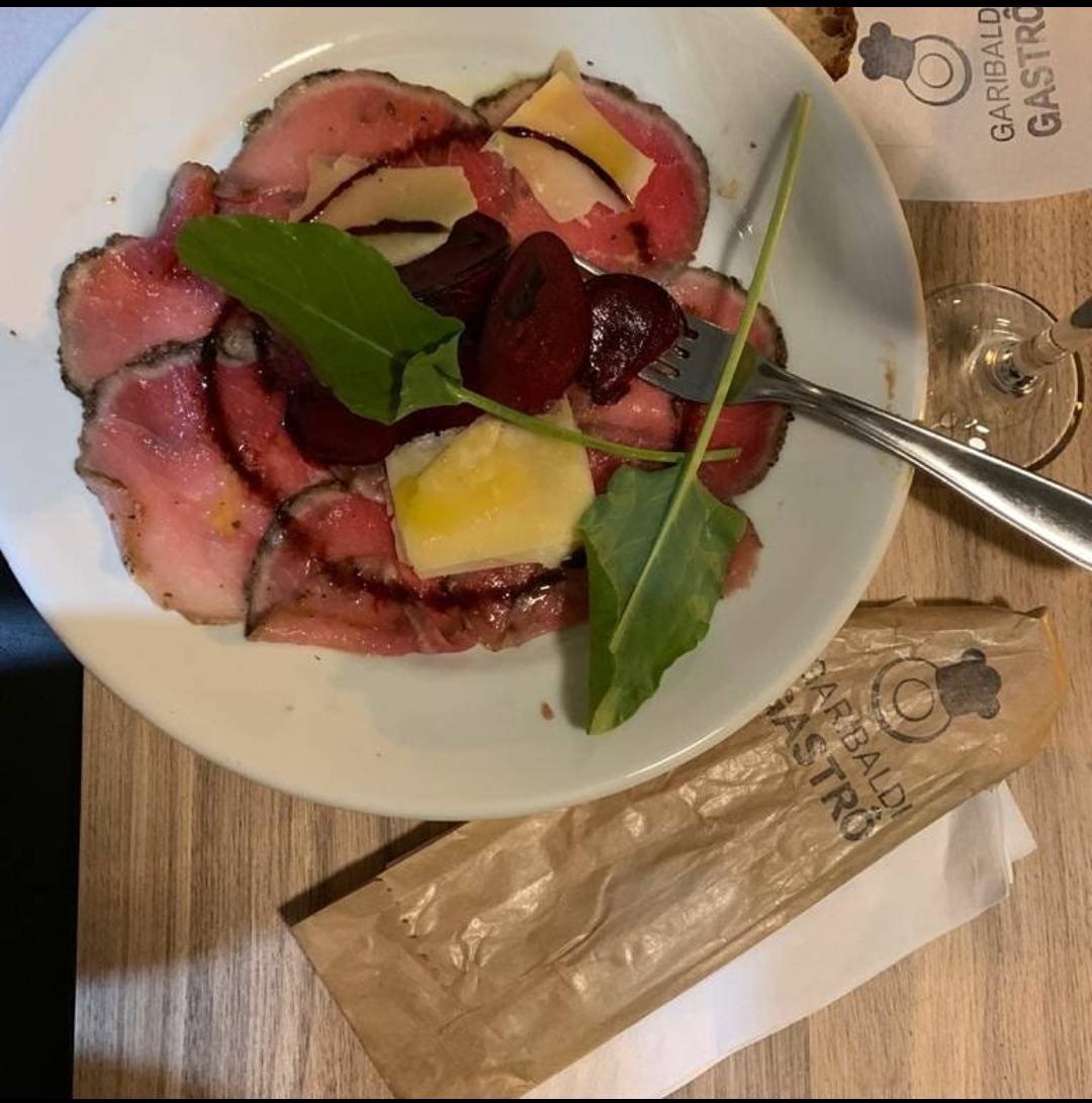 Entrada fria - carpaccio de tatu defumado e beterraba com folhas amargas, redução de balsâmico e lascas de quijo Vaccino Romano. Harmonização: Rosé Franc Dal Pizzol.