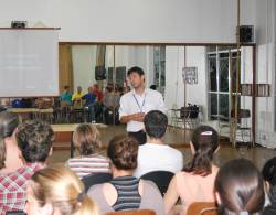 O atual Coordenador do Curso, Sidinei Pithan da Silva, fez uma fala geral sobre o funcionamento do Curso. Os veteranos tiveram a oportunidade de dar um depoimento enquanto acadêmicos do Curso de EDF, e para finalizar os novos alunos apresentaram-se e comentaram sobre suas expectativas em relação à graduação.