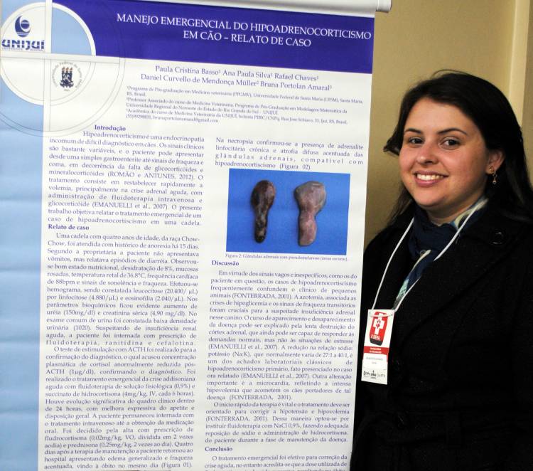 O trabalho apresentado é intitulado “Manejo Emergencial do Hipoadrenocorticismo em Cão”. Conforme explica a acadêmica, hipoadrenocorticismo é uma endocrinopatia incomum de difícil diagnóstico em cães. Os sinais clínicos são bastante variáveis, e o paciente pode apresentar desde uma simples gastroenterite até sinais de fraqueza e coma, em decorrência da falta de glicocorticoides e mineralocorticóides. O tratamento consiste em restabelecer rapidamente a volemia, principalmente na crise adrenal aguda, com administração de fluidoterapia intravenosa e glicocorticóide. O presente trabalho objetiva relatar o tratamento emergencial de um caso de hipoadrenocortiscismo em uma cadela.