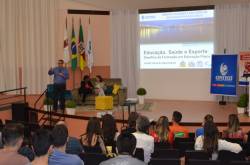 O evento iniciou com a palestra “Educação, Saúde e Esporte: Desafios da Formação Inicial em Educação Física”, ministrada pelo professor Dr. Juarez Vieira do Nascimento (UFSC).
