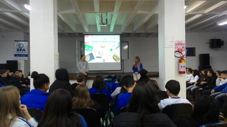 O professor Sandro Cossetin, eletrotécnico do DEMEI esteve na EFA na última terça feira, 23/05, para falar sobre energia, para alunos do Ensino Fundamental e Médio.