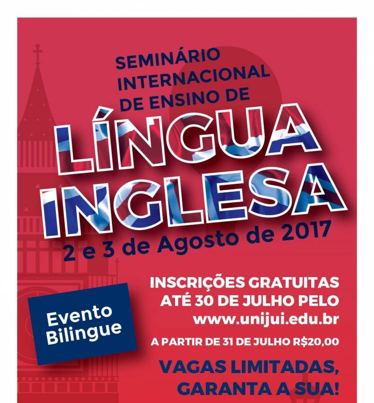 A Unijuí promove, nos dias 2 e 3 de agosto, o Seminário Internacional de Ensino de Língua Inglesa. O evento bilíngue tem inscrições limitadas e gratuitas até o dia 30 de julho, (a partir do dia 31 inscrições a R$20,00). Para aqueles que desejarem a certificação o valor da inscrição é R$10,00.