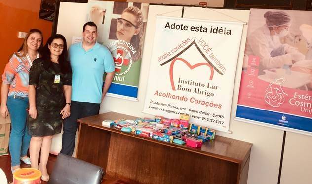 Na tarde do dia 21 de março, os coordenadores Edina Matilde Linassi Coelho e Matias Nunes Frizzo realizaram a entrega dos produtos doados no trote solidário dos cursos de Biomedicina e Estética e Cosmética. A Instituição contemplada foi o “INSTITUTO LAR BOM ABRIGO” de Ijuí.