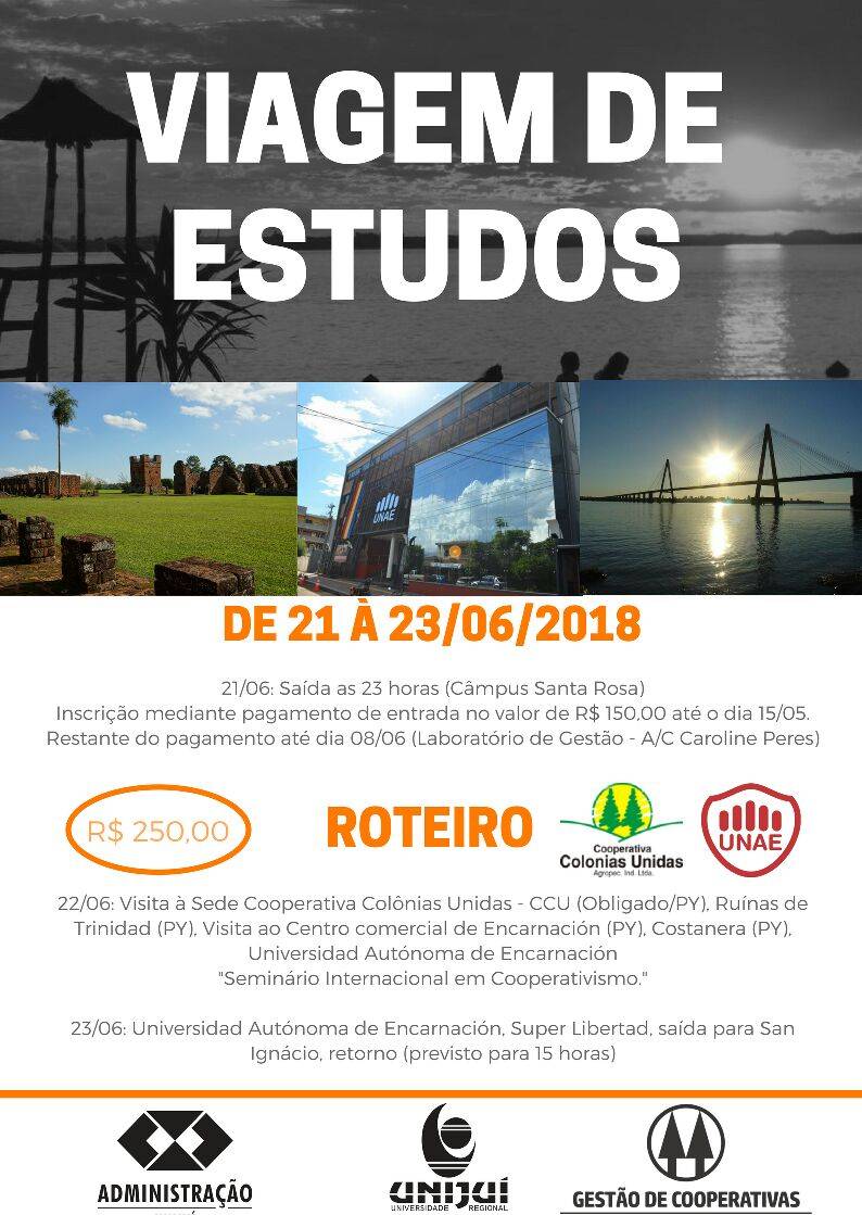 Com o objetivo de integrar e realizar trocas de aprendizagens os cursos de Administração e Gestão de Cooperativas da UNIJUÍ Campus Santa Rosa, estarão realizando uma viagem de estudos no período de 21 a 23 de junho, para o Paraguai.