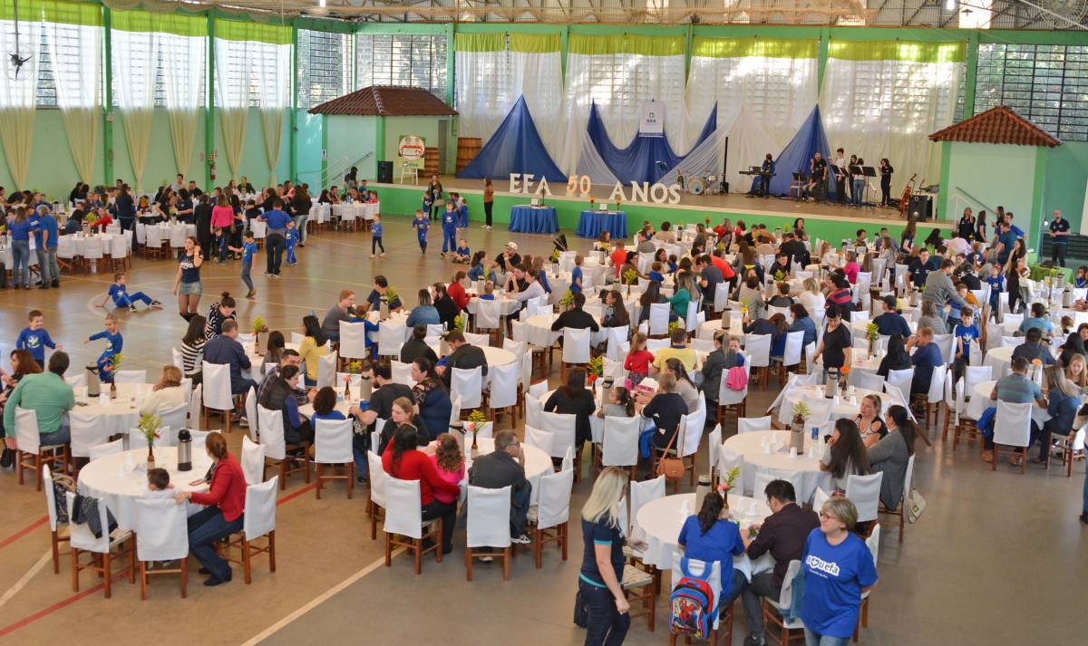 O evento, que teve organização da escola e conselho de pais, foi presenteado com um lindo dia de sol. As famílias lotaram o salão e assistiram apresentações dos grupos de dança da EFA, da orquestra e canções das turmas da Educação Infantil e Anos Iniciais, além de degustar o chá preparado pelos pais.