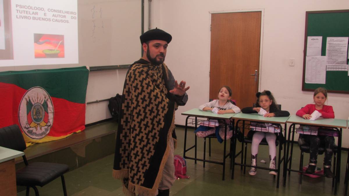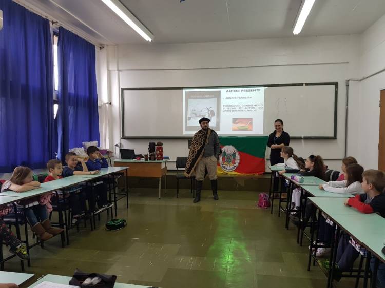 As turmas do segundo e terceiro ano do ensino fundamental da EFA, receberam na última quarta feira, 26 de setembro, o autor santo-angelense, Jonatã Ferreira, para um bate papo com as crianças sobre a cultura gaúcha e em especial a sua obra, o livro Buenos Causos. Entre uma roda de chimarrão preparada pelos estudantes, o autor inicia sua fala comentando sobre a simbologia desse ato, que o mate representa a hospitalidade e é uma forma acolhedora de receber as visitas e ainda celebrar a vida.
