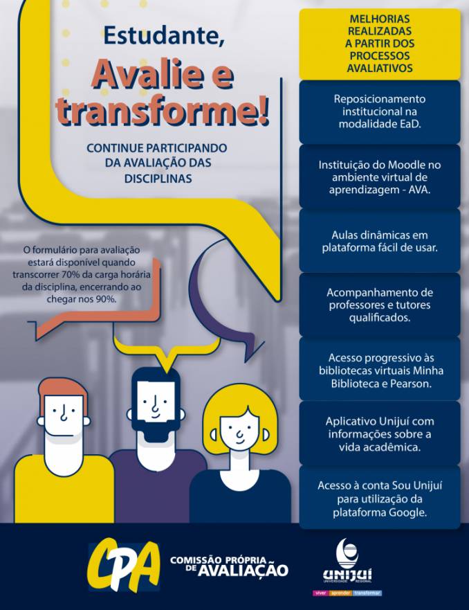 Atendendo o cronograma do Programa de Avaliação Docente, em consonância com o Sistema Nacional de Avaliação da Educação Superior – SINAES, entre o período de 16 de julho a 14 de agosto, está disponível, no portal do aluno, a avaliação das disciplinas da modalidade EaD 100%.