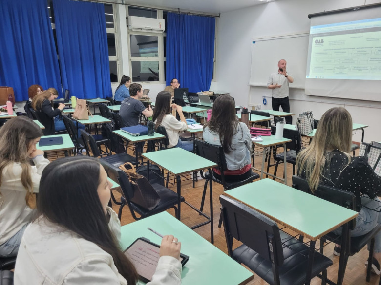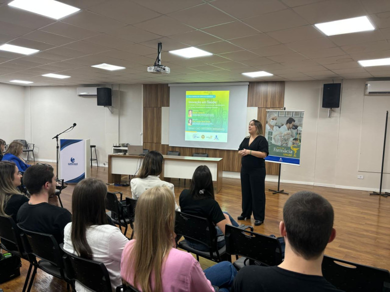 A atividade contou com a palestra “Inovação em Saúde: a Inteligência Artificial como Ferramenta no Desenvolvimento de Serviços Farmacêuticos no Ambiente Hospitalar”, a ministrada pela farmacêutica do Hospital Unimed Noroeste RS, Daniela Velasquez, que destacou, além do tema principal, um pouco de sua trajetória, da formação, ao ingresso no mercado de trabalho da área.