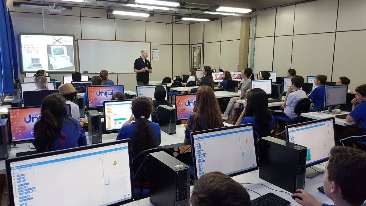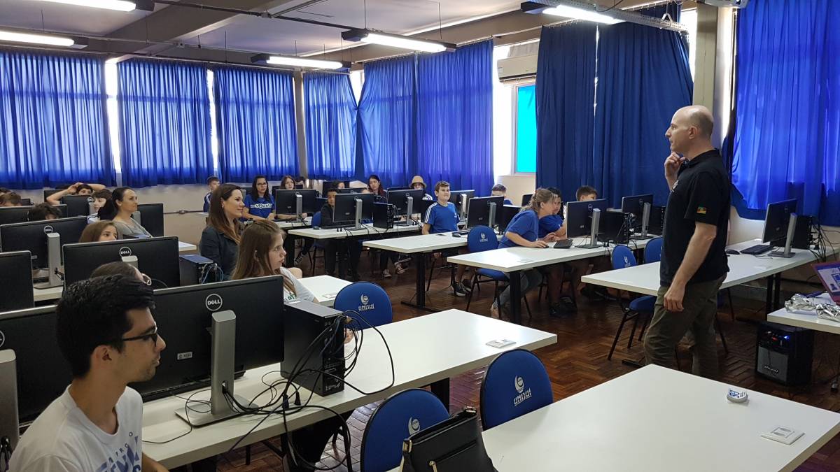 Primeiro a turma do quinto ano da Escola teve um momento de troca de conhecimentos com os colegas do sexto ano, que já fazem parte dos anos finais. Nesta etapa os estudantes começam a ter disciplinas individuais, consequentemente mais professores e desafios diferentes que já enfrentaram até então. Marcou o seminário do quinto ano uma aula especial de programação, através do uso da plataforma Scratch, no Laboratório de Ciências da Computação, sob orientação do professor Edson Padoin e bolsistas do projeto Meninas Digitais. Nesta ocasião os estudantes puderam construir um jogo e vislumbrar as diversas possibilidades do uso da tecnologia.