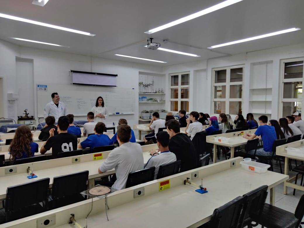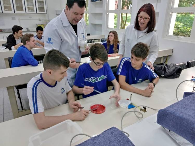 Em um segundo momento os estudantes do nono ano tiveram a troca de experiências com os colegas do primeiro ano sobre o Ensino Médio. Essa atividade foi realizada no Campus Ijuí e contou com uma aula surpresa, ministrada pelo professor de Bioquímica da Unijuí, Matias Frizzo, com auxílio da professora de Biologia da EFA, Sandra Gelati. Na oportunidade os estudantes realizaram a extração do DNA de um morango e posteriormente realizaram análises nos laboratórios de microscopia da Unijuí.