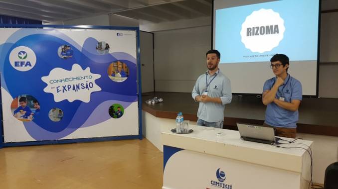 Para falar especificamente sobre esta produção e auxiliar os alunos com esta mídia, os jornalistas da Unijuí, Fernando Goettems e Douglas Dorneles, apresentaram o case do programa Rizoma. Este programa, que era transmitido pelo rádio, recentemente foi moldado para ser transformado em podcast. Durante a fala, os comunicadores explanaram a própria experiência e revelaram que a Unijuí, entre as Universidade Comunitárias, é uma das pioneiras nesta mídia. Segundo Fernando, o podcast vem crescendo no Brasil, tanto em audiência, quanto em variedade na oferta de programas e formatos. “Caiu no gosto de bastante gente, até eu diria que para muitos se tornou um hábito ouvir podcast enquanto se exercita, lava louça ou arruma a casa, se locomove para o trabalho, por exemplo”, complementa.