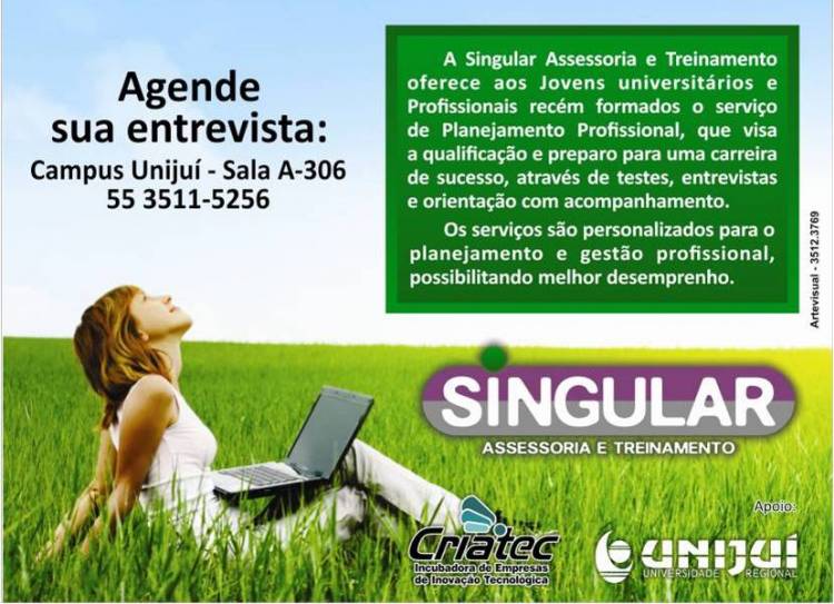 Mais informações através do telefone 55 3511-5256, ou na sede da Singular Assessoria localizada junto ao Campus da UNIJUÍ - Sala A 306.