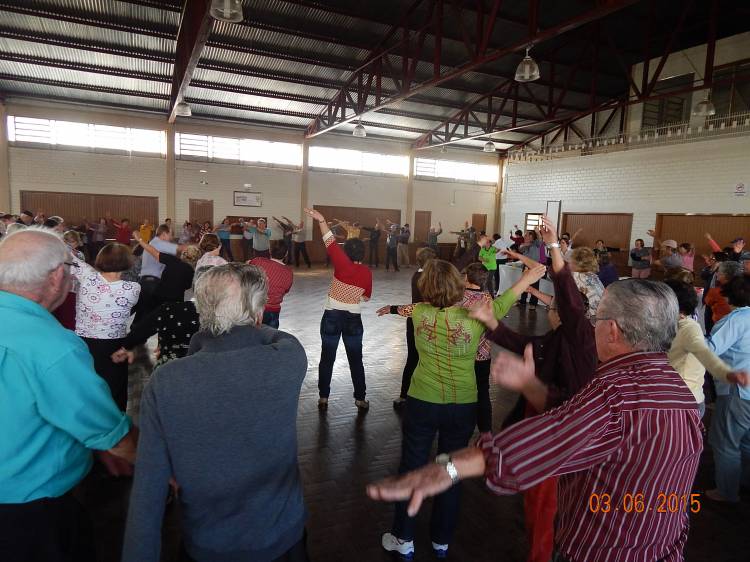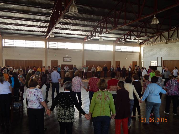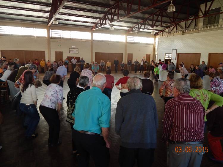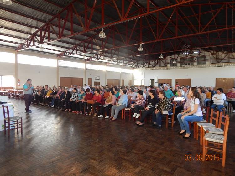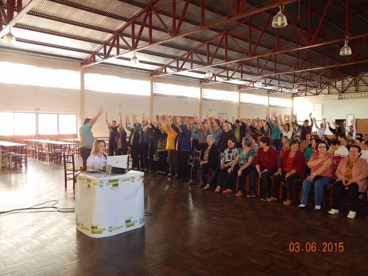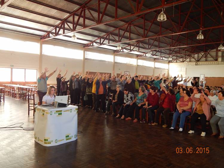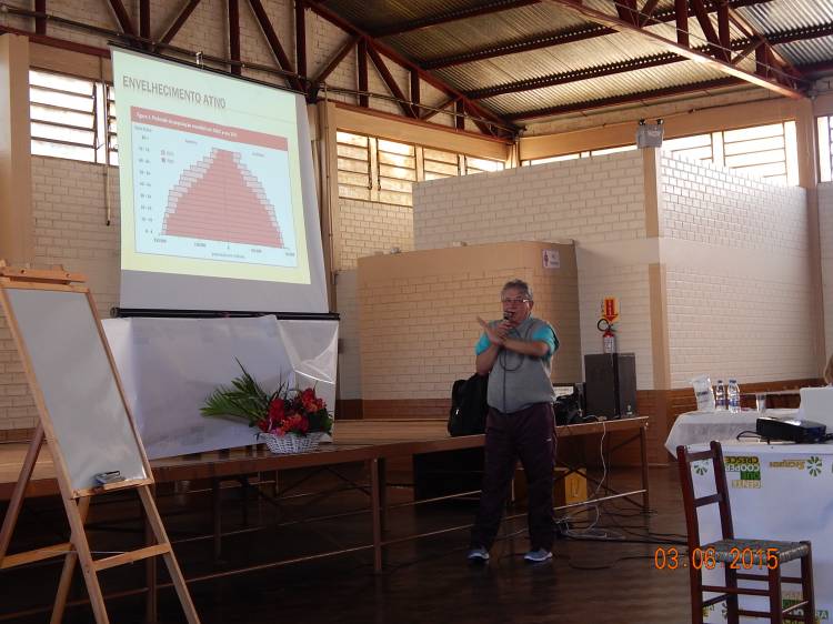 Alunas do curso de Especialização em Saúde do Idoso da UNIJUÍ, juntamente com Associação Hospitalar Tucunduva e Novo Machado pelo programa ambulatorial do idoso, Viva Bem sua Idade, promoveram o 1º Encontro Envelhecendo com Saúde. O evento foi realizado no Salão Paroquial de Tucunduva, no dia 03 de junho, com palestra do Professor Doutor Leopoldo Schonardie Filho, do curso de Educação Física da Unijuí, com o tema Qualidade de Vida no Envelhecer. O evento teve a participação de 136 idosos, e de um grupo de mulheres que preparam um belíssimo lanche com confecção de cucas.