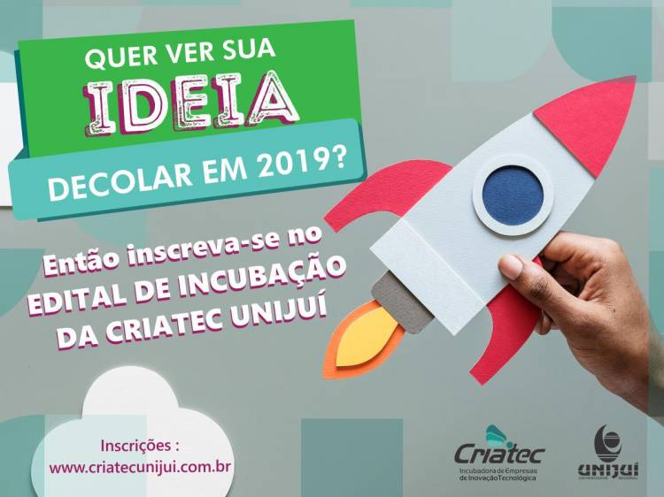 Se você tem uma ideia de negócio inovador com base tecnológica ou de impacto ambiental, ou ainda de impacto social e base criativa, chegou a hora de tirar a ideia do papel. Está aberto o edital da Incubadora de Empresas de Inovação Tecnológica da Unijuí (Criatec) para seleção de quatro projetos, no programa de incubação na Unijuí Campus Santa Rosa.