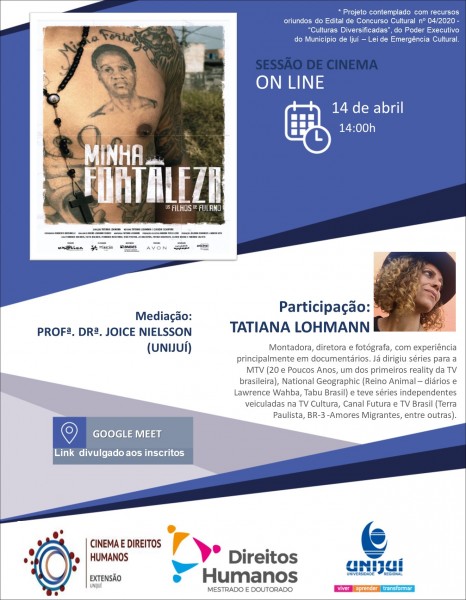 O Projeto de Extensão Cinema e Direitos Humanos da Unijuí realiza na próxima quarta-feira, dia 14 de abril, às 14h, a sessão do filme “Minha fortaleza, os filhos de fulano”. Mediada pela professora doutora Joice Nielsson, a sessão contará com a presença da diretora do filme, Tatiana Lohmann. Para se inscrever, basta acessar este link.