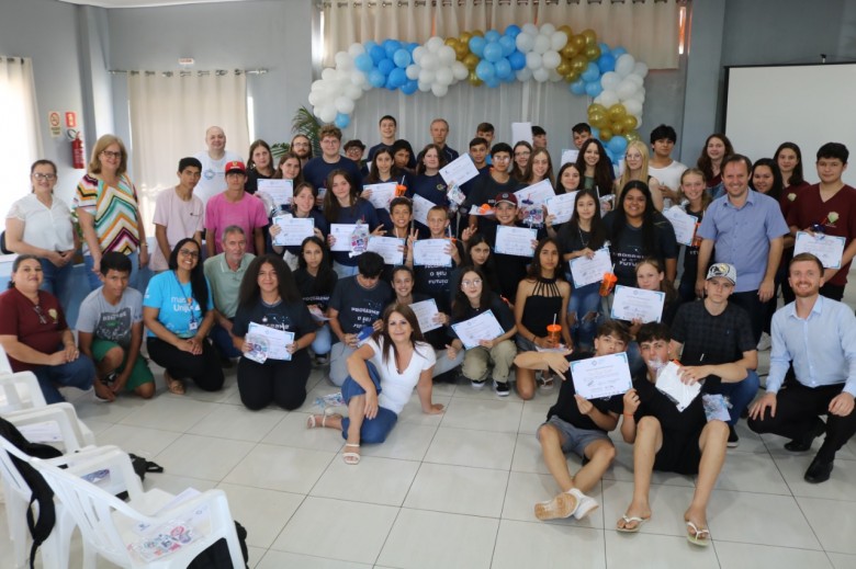 Estudantes das redes municipal e estadual do município de Chiapetta, que participaram das oficinas do Projeto de Extensão Programe seu Futuro da Unijuí, receberam na tarde desta quinta-feira, 1º de dezembro, seus certificados de conclusão dos módulos Scratch, Kodular e Jogos GDevelop.