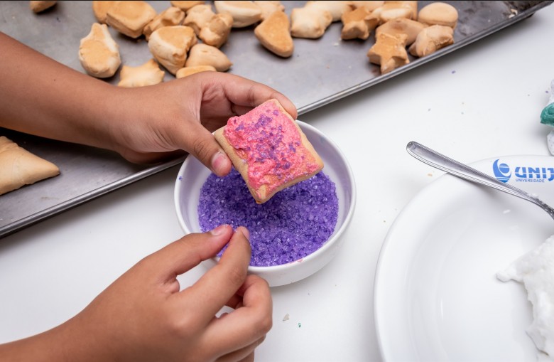 O Projeto de Extensão Gestão Social e Cidadania, da Unijuí, promoveu nesta terça-feira, 12 de dezembro, uma atividade diferente, aproximando a comunidade e a Universidade. Em alusão ao Natal, as crianças moradoras dos bairros Pindorama e Thomé de Souza, que frequentam a Estação e Parque da Pedreira, estiveram no Laboratório de Gastronomia e Nutrição da Unijuí produzindo bolachas decoradas.