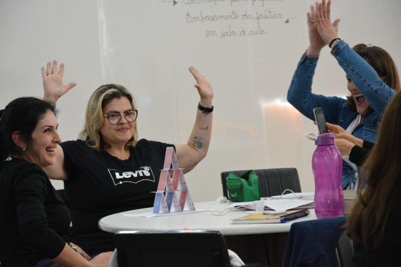 Na oportunidade, foram realizadas atividades de integração, nas quais os professores compartilharam opiniões e algumas dificuldades em tratar itens no componente curricular escolar, que antes não existiam. Também foi realizada uma prática utilizando um baralho de cartas, com o desafio de planejar e montar um castelo de cartas, dentro de uma verba estipulada para o desenvolvimento.