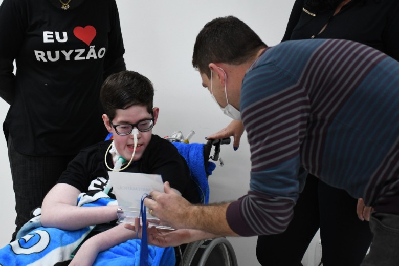Outro sonho do garoto, como gosta de ser chamado, era receber uma medalha, conforme relatou a professora Nadir Colling, da Escola Estadual de Ensino Médio Ruy Barbosa (Ruyzão), que dá aulas para Jean duas vezes por semana. Ela auxilia no aprendizado do menino desde 2021, quando ele ingressou no Ensino Médio. E, nesta edição da Feira de Matemática da Unijuí, esse sonho foi concretizado.