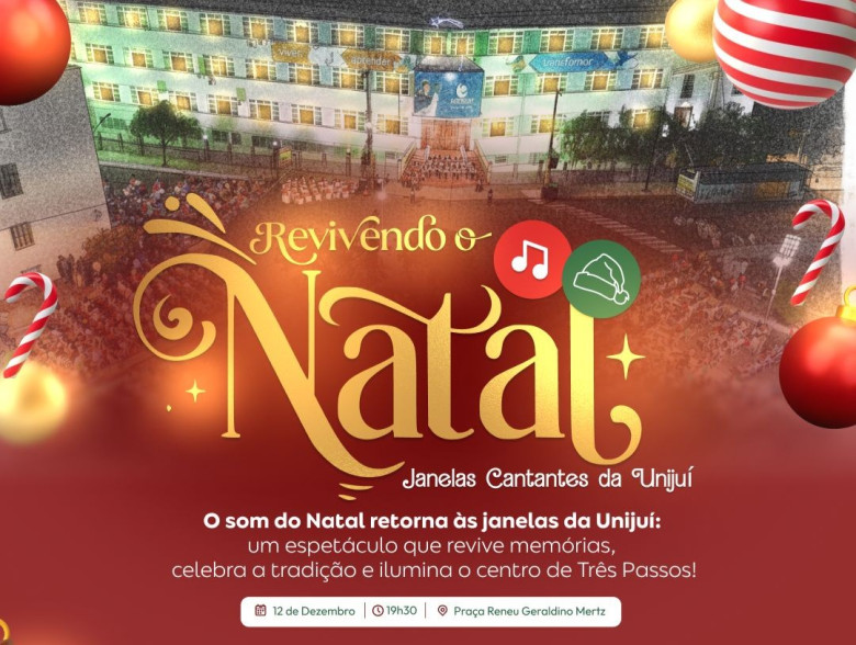 Em uma ação conjunta entre a Unijuí, Prefeitura Municipal de Três Passos, Câmara do Comércio, Indústria e Serviços de Três Passos (Cacis) e o Projeto Cante e Encante, está de volta o evento “Janelas Cantantes da Unijuí”. A apresentação, que não acontecia desde 2018, promete encantar o público e evidenciar a magia do Natal no coração de Três Passos.
