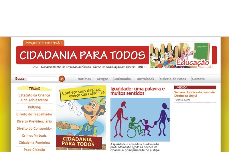No mês de maio, durante a semana jurídica do Curso de Direito, o projeto lançou o seu site: www.cidadaniaparatodos.com. O objetivo do site é socializar as discussões realizadas pelo projeto nos seus diferentes temas, dentre os quais: Estatuto da Criança e do Adolescente, Violência doméstica, Bullying, Direito do Trabalho, Direito Previdenciário, Direito do Consumidor e crimes virtuais. O programete “papo cidadão” também complementa o trabalho do projeto. O mesmo se propõe a entrevistar professores do Curso de Direito e outros profissionais, com conhecimentos específicos em temas de interesse geral, sendo os mesmos veiculados na Rádio Unijuí FM e em rádios comunitárias da região. Tais entrevistas se encontram postadas no referido site. Artigos jornalísticos semanalmente atualizados também compõem o site, todos de autoria dos próprios integrantes do projeto, ficando também aberto para interessados a publicação.
