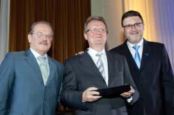 Governador Tarso Genro e o Secretário da Ciência, Inovação e Desenvolvimento Tecnológico, Cleber Prodanov entregam placa a Telmo Rudi Frantz