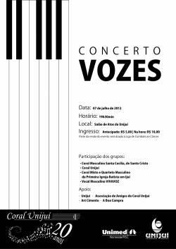 Nesta edição, o evento contará com o Coral Masculino Santa Cecília, de Santo Cristo, Vocal Masculino VIVAVOZ, de Ijuí, Coral da Primeira Igreja Batista de Ijuí e o próprio Coral da UNIJUÍ. A característica do Concerto é a promoção do canto coral através da integração de diferentes grupos vocais.