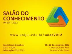 Estão abertas as inscrições para o Salão do Conhecimento 2012, evento que acontece de 23 a 26 de outubro. As inscrições podem ser feitas pelo site do Salão do Conhecimento até o dia 15 de agosto. Os trabalhos podem ser inscritos em três modalidades: participantes da UNIJUÍ, participantes de outras instituições e estudantes do ensino fundamental e médio. A data limite para o envio das propostas para realização de painéis temáticos é o dia 30 de agosto.