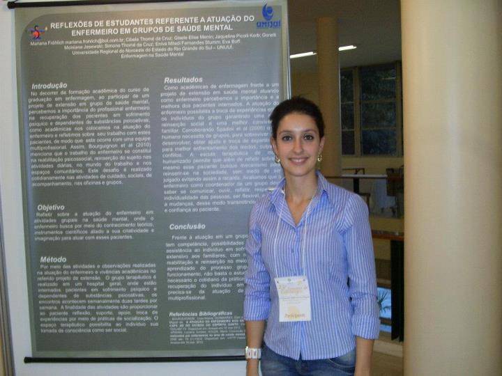 Ainda em relação ao evento da UFRGS, uma das bolsistas voluntárias do projeto de extensão que ocorre no Hospital Bom Pastor, Mariana Frolich, apresentou o trabalho “A enfermagem no cuidado a indivíduos alcoolistas internados em um hospital geral” de autoria de Rosilda de Oliveira, Cibele Thomé da Cruz, Liamara Denise Ubessi, Mariana Frohlich, Mônica Estela Casarotto, Rosane Maria Kirchner e Eniva Miladi Fernandes Stumm.