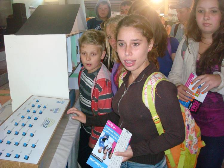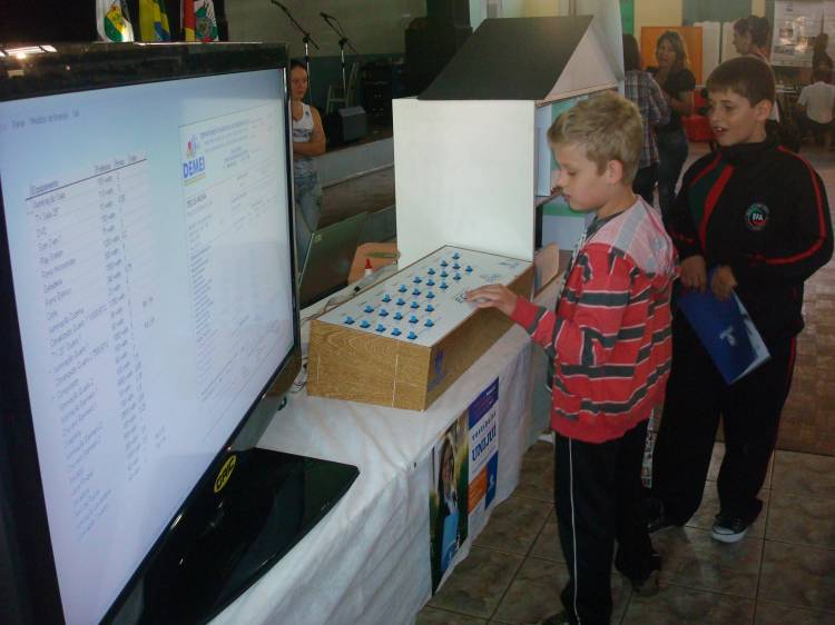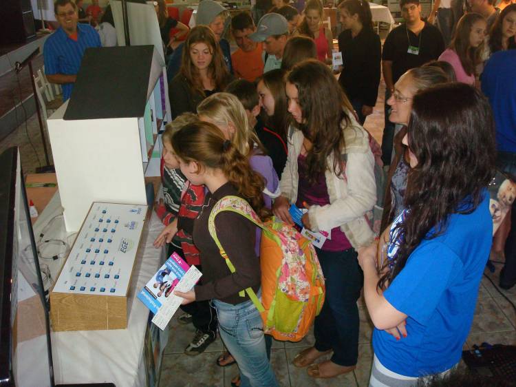 A UNIJUÍ expõe um projeto do curso de Engenharia Elétrica 'Educação em Eficiência Energética: construindo um futuro sustentável”. Uma casa em miniatura simula o consumo de energia elétrica de acordo com o uso de equipamentos no dia-a-dia de uma residência. Em um painel de comando interativo os alunos ligam eletromésticos na casa em miniatura e, em um televisor, conseguem obter a simulação de um conta de energia elétrica, de acordo com o consumo escolhido. O projeto é desenvolvido pelo Grupo de Automação Industrial e Controle (Gaic/UNIJUÍ) e Departamento Municipal de Energia de Ijuí (Demei).