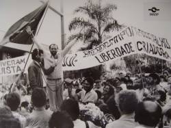 Foto: Comemoração da aprovação do reconhecimento da Unijuí, em 10.05.1985. Professor Adelar Baggio, quando da chegada à Unijuí depois do desfile no centro de Ijuí. Arquivo MADP/FIDENE.