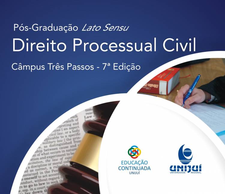 O Departamento de Ciências Jurídicas e Sociais (DCJS) da UNIJUÍ está ofertando o Curso de Especialização em Direito Processual Civil, no Câmpus Três Passos, o qual possui viés acadêmico e oportuniza o aperfeiçoamento e a qualificação na área do Direito Processual Civil, contemplando as inovações propostas no projeto do novo Código de Processo Civil.