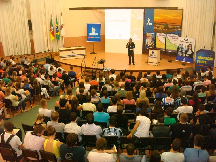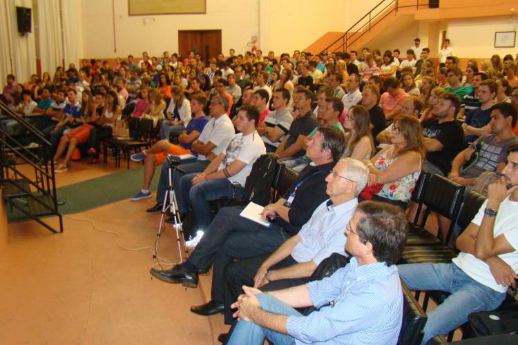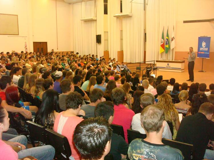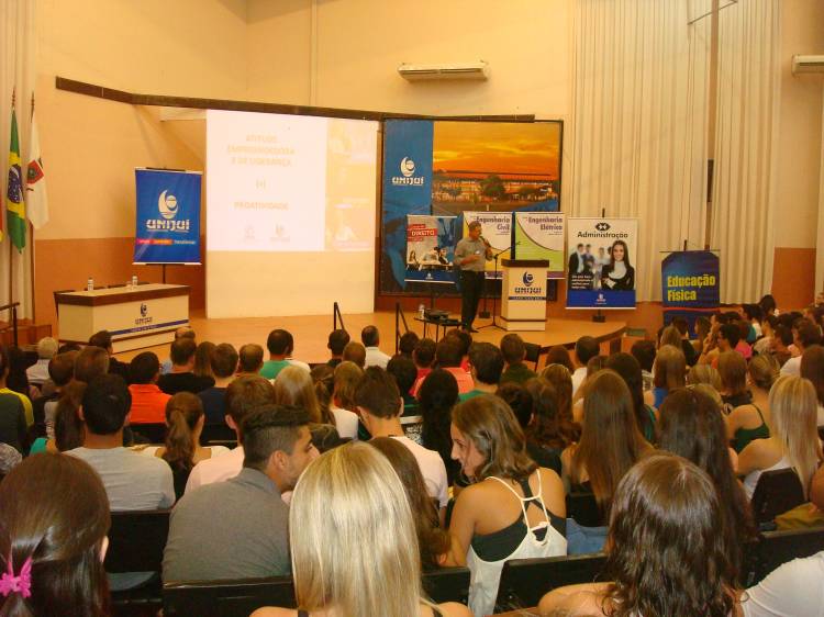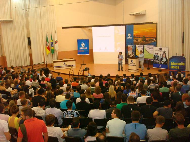 As atividades letivas já iniciaram na UNIJUÍ e vários cursos do Câmpus Santa Rosa estão realizando programações especiais para recepcionar os estudantes. Na noite de segunda-feira, dia 2, o Curso de Administração do Câmpus Santa Rosa recepcionou os acadêmicos do curso de Administração, Direito, Engenharia Elétrica, Engenharia Civil e Educação Física para a aula inaugural no Auditório Central do Câmpus.