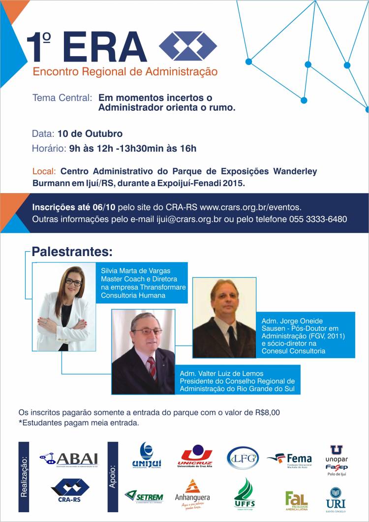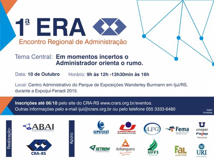 Para marcar a data, será realizado o 1º ERA - Encontro Regional de Administração, promovido pela Associação dos Bacharéis em Administração de Ijuí (ABAÍ), em parceria com o Conselho Regional de Administração do Rio Grande do Sul.
