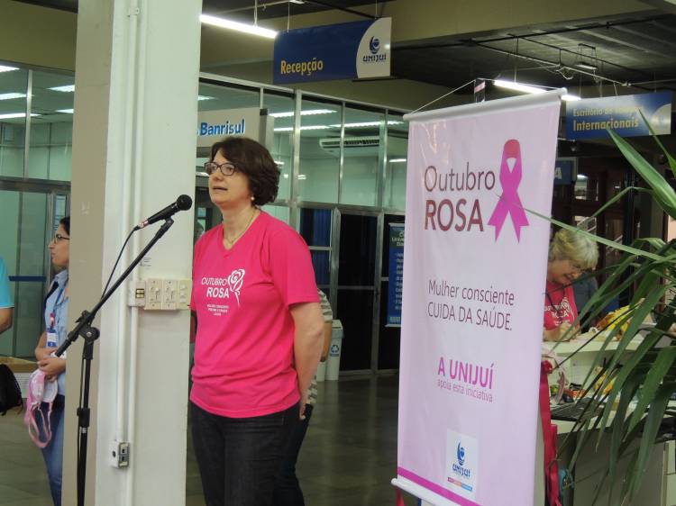 A professora Arlete Roman, do Curso de Enfermagem, falou sobre a campanha, que este ano tem como slogan “Vamos falar sobre isso”. Segundo ela, a Fidene/Unijuí esteve sempre engajada nesta campanha, que mundialmente é desenvolvida desde a década de 90, por entender que é compromisso de todas as instituições e de toda a sociedade falar sobre este tema, alertando para a conscientização e a troca de informação sobre a prevenção. “Não queremos discutir só a doença, mas queremos discutir a ideia de identificar o câncer precocemente, pois quanto mais cedo a descoberta, maior a chance de cura, de um tratamento ser eficaz. A Universidade sempre se coloca parceira dessa campanha justamente para fazer um chamamento a toda sociedade”. Sobre a ação da Rede de Sutiãs Cor-de-Rosa, destacou como uma ação diferenciada. “Ousamos no sentido de dizer que o sutiã nos representa, fazendo com que entremos de peito nesta campanha”.