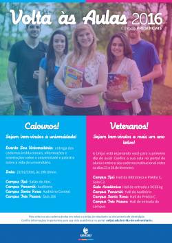 A volta às aulas terá programação especial para os calouros, nos Campi Ijuí, Santa Rosa, Três Passos e Panambi, com a realização do evento Sou Universitário. No evento, os novos alunos serão recebidos por integrantes da Reitoria. Os calouros terão a oportunidade de conhecer a universidade através de um vídeo de orientações, além de assistir uma palestra sobre a vida de universitário e receber cadernos da instituição.