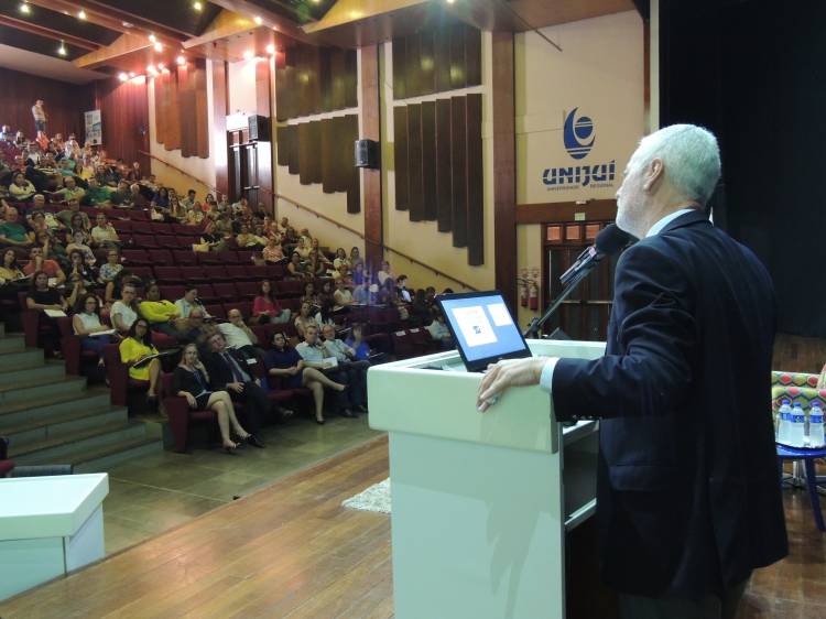 “O professor universitário na sociedade contemporânea: novo papel e desafios” foi o tema abordado na tarde de quinta-feira, no Salão de Atos do Campus Ijuí, pelo renomado educador e pesquisador Antônio Nóvoa, doutor em Ciências da Educação pela Universidade de Genebra e História Moderna e Contemporânea pela Paris-Sorbonne. Nóvoa foi o palestrante deste módulo do Programa de Formação Docente da UNIJUÍ. Na mediação da palestra, atuou o professor do programa de pós-graduação em Educação nas Ciências da Unijuí, Otávio Aloísio Maldaner.