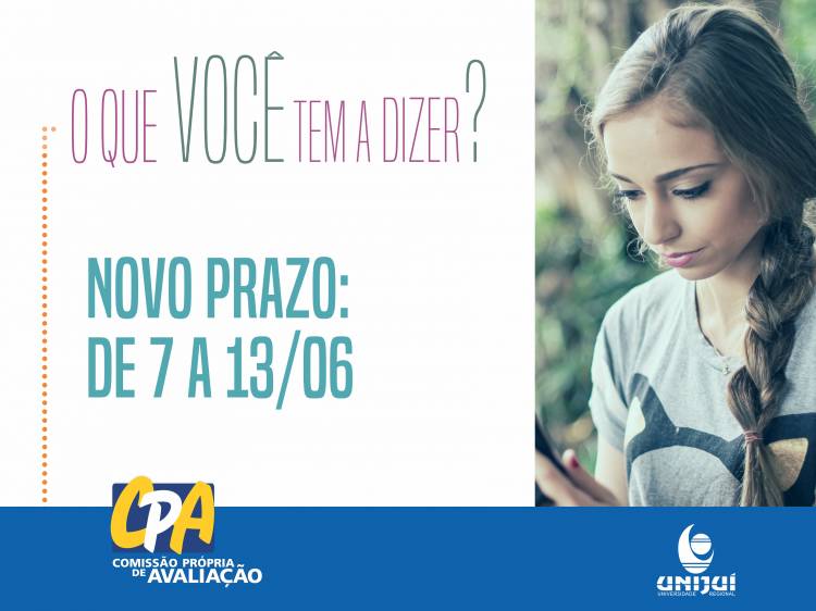 A Vice-Reitoria de Graduação (VRG) e a Comissão Própria de Avaliação (CPA) da UNIJUÍ, que coordenam o processo de Avaliação Docente, prorrogaram o prazo para os estudantes falarem o que pensam sobre as disciplinas e sobre o desempenho dos professores durante o semestre. A avaliação pode ser feita até a próxima segunda-feira, 13 de junho.