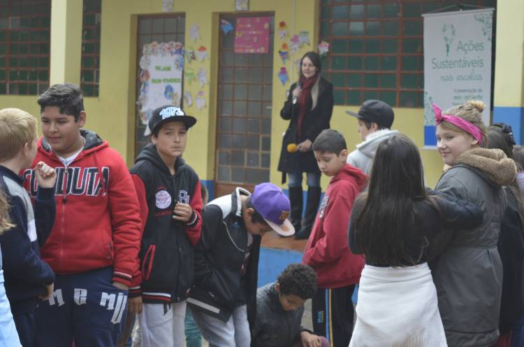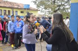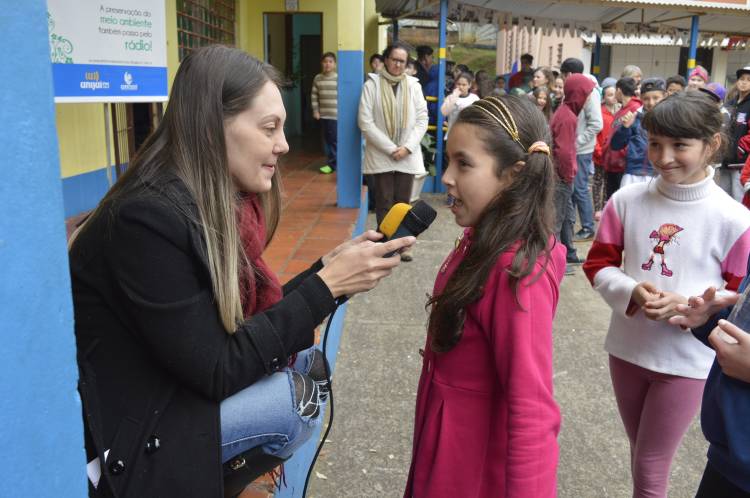 Na Escola São Geraldo, 220 alunos do 1º ao 7º foram reunidos no pátio, local onde ocorreu a dinâmica: falas no microfone, lembranças do conteúdo veiculado no rádio e dicas para a preservação do meio ambiente.
