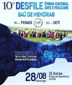 Neste domingo, dia 28, a partir das 15h, na Praça da República de Ijuí, será realizado o 10º Desfile Étnico-Cultural da UETI (União das Etnias de Ijuí), com o tema “Baú de Memórias – FENADI 30 Anos”.