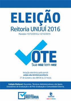 No dia 27 de outubro acontece a votação para a escolha do reitor e dos vice-reitores da Unijuí para o mandato que vai de 13/12/2016 a 12/12/2019. Uma comissão eleitoral formada pelos representantes do corpo docente, Eniva Milani Fernandes Stumm e Joaquim Henrique Gatto, pelos representantes dos técnicos-administrativos, Fabio Frá Fernandes e Sandra Maria da Silva, pela representante do corpo discente, Luana Cristina Dryer, e pelo representante da comunidade externa, Odacir Secchi, está dando andamento ao processo, de acordo com os estatutos da Fidene e da Unijuí.