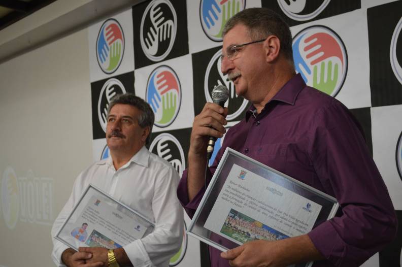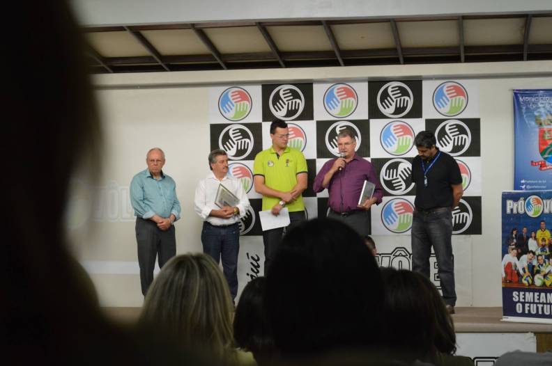 O evento do Pró-Vôlei, realizado na manhã de hoje, homenageou o atual prefeito de Ijuí Fioravante Batista Ballin; o ex-reitor da Unijuí Martinho Luís Kelm; as equipes da Smed e Smcet; bem como todos os professores, coordenadores e estagiários envolvidos na iniciativa. Foram entregues camisas e bolas de vôlei de forma simbólica ao prefeito eleito para a gestão 2017/2020, Valdir Heck; e ao novo vice-reitor de Graduação, Pesquisa e Extensão da Unijuí, Fernando Jaime González, que representava a atual reitora Cátia Maria Nehring.