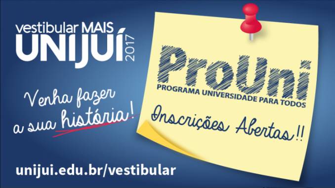 A partir desta terça-feira, 31 de janeiro, podem ser feitas as inscrições para o Programa Universidade para Todos (ProUni), referente ao primeiro semestre de 2017. As inscrições ficam abertas até a próxima sexta-feira, dia 03 de fevereiro. O processo seletivo terá uma única etapa de inscrição, que deve ser feita diretamente no site do ProUni, com duas chamadas dos candidatos pré-selecionados. Neste semestre a Unijuí oferece um total de 138 bolsas do ProUni, todas integrais de 100%, distribuídas entre seus cursos e campi. Confira o edital e as bolsas ofertadas.